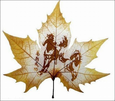 Natural leaf carving is actual manual cutting and removal of a leaf's surface to produce an art work on a leaf. The process of carving is performed by artists using tools to carefully the surface without cutting or removing the veins. The veins add detail into the subject matter of the carving.